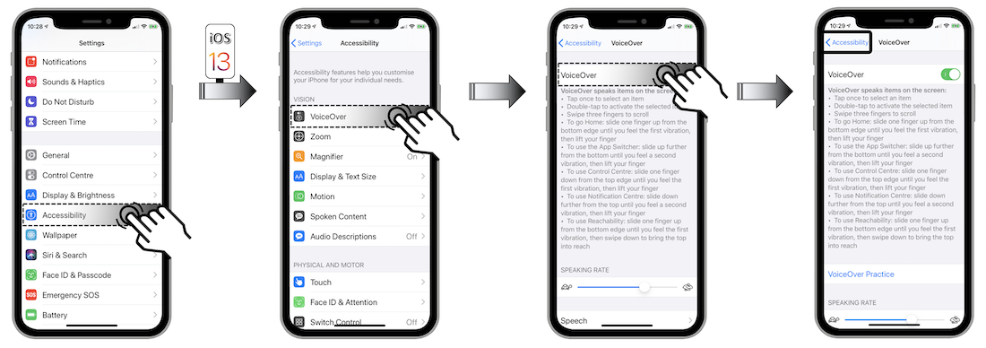 First, VoiceOver common gestures will be introduced to be followed by iPhoneX dedicated gestures.