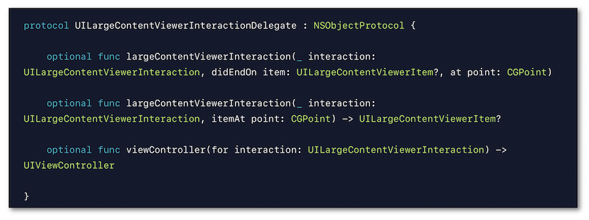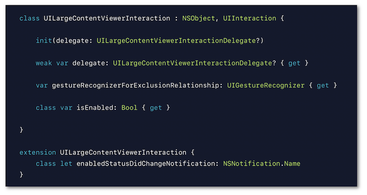 The UILargeContentViewerItem protocol (05:35) defines the needed information for the large content viewer and is already implemented by the UIView class that provides setters as well (no need to subclass and override):