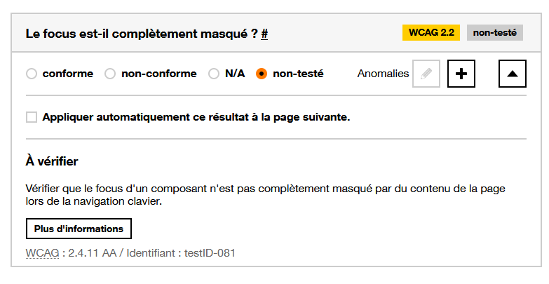 - Le focus est-il complètement masqué ?, lié au WCAG 2.4.11 AA