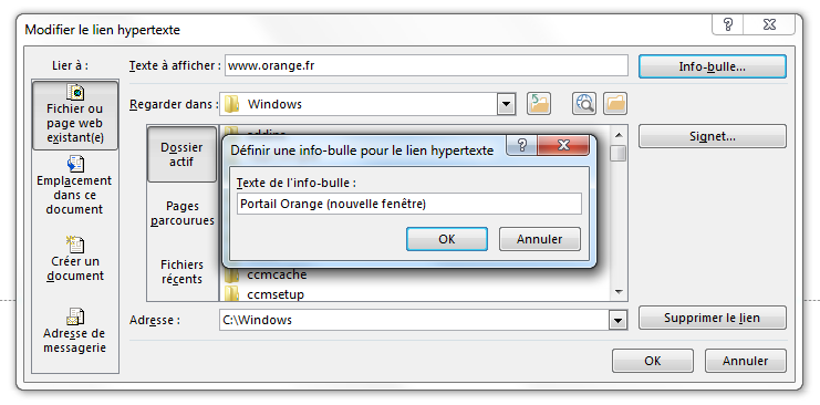 - menu Insertion > Lien hypertexte > Info-bulle : ajouter « nouvelle fenêtre » dans le libellé