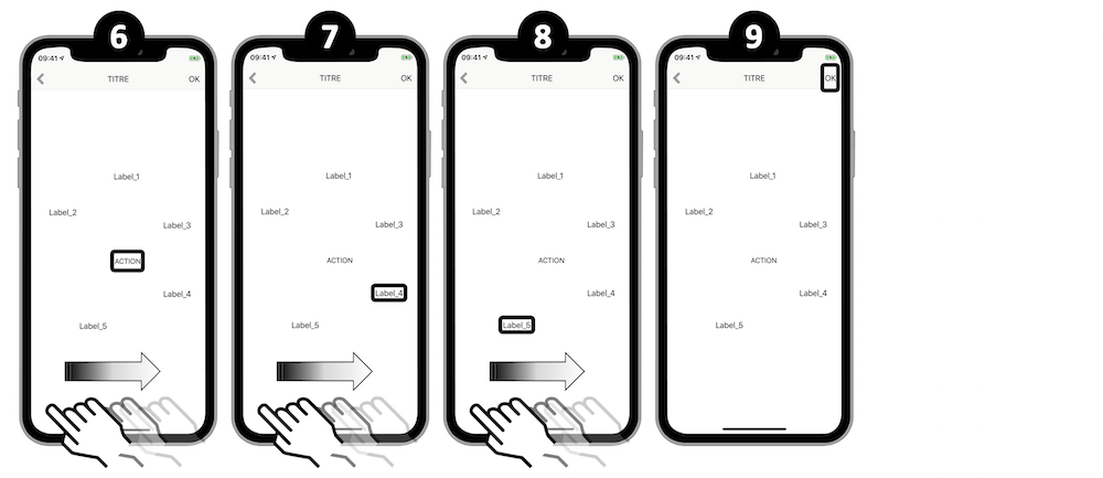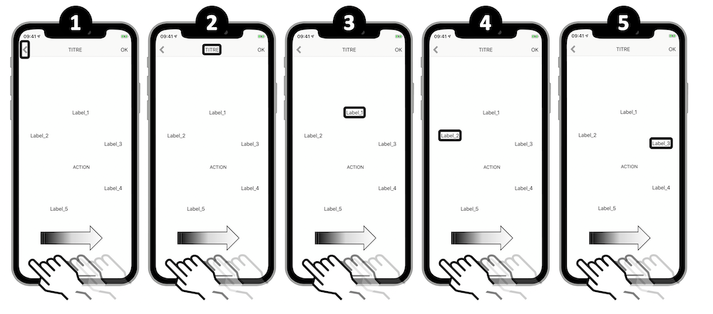 L’ordre de vocalisation est toujours le même (label, value, trait et hint), il ne peut pas être changé et la vocalisation est réalisée en une seule fois à l’arrivée sur l’élément.