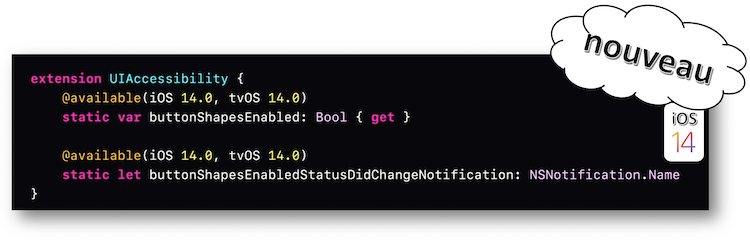 Même si l'apparence d'un bouton peut se faire uniquement à l'aide d'un contraste et d'un contour spécifiques, une nouveauté iOS 14 permet de mettre en avant ce type d'éléments par le biais de la préférence système Boutons avec contour dont on peut désormais connaître l'état (l'accès au réglage dans le menu existe depuis iOS 7).
